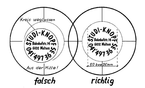 a) Bei Rundschrift-Signeten (z. B. STUDI-KNOPF, siehe unten) darf der Aussendurchmesser der Rundschrift im Maximum50 mm (beim 55 mm Knopf) und 34mm (beim 37mm Knopf) betragen.